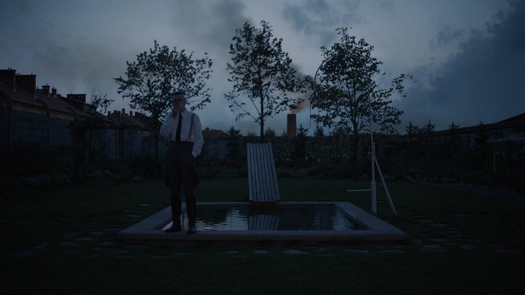 امّا تصویرها خود نیز قابل توجه مینماید. دو جنس/ شکل تصویر در منطقه دلخواه وجود دارد. اصلیترین شکل تصویرگری، قابهایی است که به زندگی «رودولف هوس» و خانوادهاش میپردازد؛ خانوادهای که آرامش را در خانهی خود و رودخانه و باغنمایی که نزدیک آن است یافتهاند. گاه میهمانی میدهند و گاه تنهایی خلوت میکنند و لحظهای راه به اندوه نمیدهند. شکل تصاویرِ مربوط به این خانواده، بهشدت نقاشانه است. دوربین ثابت و بهصورت «تابلوی زنده» (Tableau vivant) درآمده و در هر قاب، نقاطی متحرک و مشخص برای جلب توجه وجود دارد. برای نمونه، قابها عمدتاً تصویرکننده سرسبزیِ باغ و سرزندگی خانه است امّا گوشههای قاب را مثلاً دودکشی در دوردست (اردوگاه) یا آتشی شعلهور که نشان میدهد زندهها و مردهها را دارند میسوزانند، پُر کرده که بلافاصله تمرکز را بهخود میگیرد؛ این تمهید البته معلول صدایی است که نخست توجه را به خود میگیرد. تماشاگر ابتدا از طریق صداست که به آشوویتس پی میبرد و طبیعی است که در قابها بهدنبال منبع صدا میگردد. صدا، عاملی است به ایجاد یک روایت ذهنی (اینکه چه بر سر یهودیان میآید) و تصویر هرچهقدر در تلاش برای نشان ندادن باشد، یک نقطه، یک جزء، یک اشاره به اردوگاه کافی است که حواس را از ابتذال زندگی افسر «هوس» و خانوادهاش پرت کند به سمت یک جنایت تاریخی (عکس ۱)