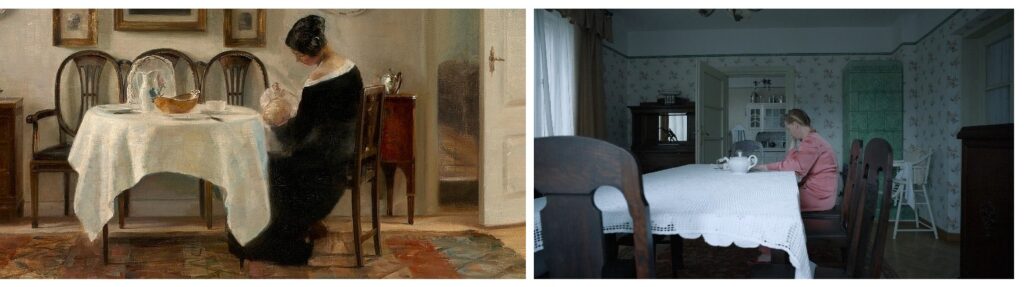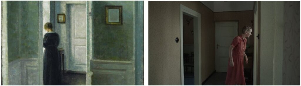این تصاویر یادآور سبک ویلهم هامرشوی -نقاش دانمارکی- است. «تنهایی» یکی از مضامین کلیدی در نقاشیهای هامرشوی است. او قاب را چنان ترسیم میکند که انسان در محاصرهی اشیا قرار گرفته و تنهاییاش بیش از پیش نمایان میشود -گویی انسانِ قرن نوزدهمی در نقاشیهای هامرشوی از جامعهی صنعتی به خانهاش پناه برده و این خانه محملی به تنهایی است. از این روی معمولا انسان میان چارچوب در یا از گوشهی اتاق دیده میشود. این سبک را میتوان در تابلو-زندههای منطقه دلخواه دریافت کرد؛ خانوادهای که به خانه -به منطقهی مورد علاقهشان- پناه آوردهاند. با این تفاوت که هامرشوی این تنهایی را ناگزیری انسان مدرن میخواند در حالی که منطقه دلخواه درباره خانوادهی یک افسر آلمانی است که بهانتخاب خود و با کمال میل در جوار جسدهای سوختهی یهودیان زیست میکنند؛ بنابراین طبیعی است که رنگهای کدر که پایهی نقاشیهای هامرشوی است در منطقه محبوب به رنگهای زنده و جلوهگر بدل شود (عکس ۲ و ۳)